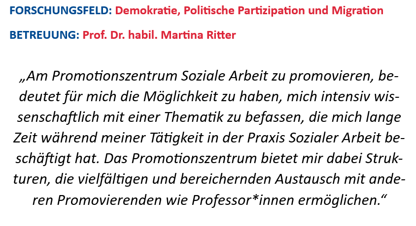 Im Rahmen des Dissertationsprojekt wird dies am Beispiel von Menschen mit Migrationserfahrungen beforscht, die den Übergang von einem autokratischen in ein demokratisches politisches System erlebt haben. Untersucht wird, wie stark die politische Primärsozialisation Jahrzehnte nach der Migration auf Haltung und Handeln wirkt und welchen Beitrag deutsche – politische wie gesellschaftliche – Kulturen und Strukturen bei der Aneignung demokratischer Werte und Kompetenzen leisten.