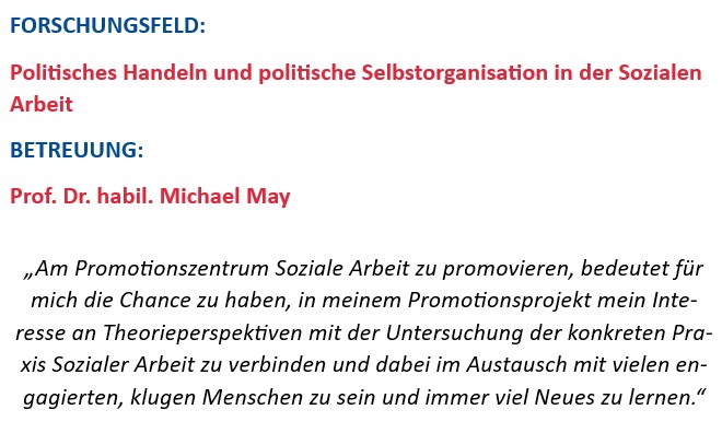 Das Promotionsprojekt untersucht die Hervorbringung und Organisation des Politischen in der Sozialen Arbeit. Hierfür werden zwei politische Selbstorganisationen Sozialer Arbeit bei der Konzeption, Organisation und Umsetzung politischer Aktionen begleitet. Ziel der Forschung ist die Rekonstruktion von Arbeitswissen und -prozessen sowie die Analyse kontextübergreifender Organisations- und Institutionsformen des Politischen in der Sozialen Arbeit. Zudem wird untersucht, welche Ideen und Diskurse zum Politischen in der Sozialen Arbeit im politischen Handeln reproduziert oder transformiert werden. Hierbei werden auch Spannungsfelder und Widersprüche politischen Handelns in der Sozialen Arbeit deutlich. Theoretisch orientiert sich die Arbeit an einem poststrukturalistischen, radikaldemokratischen Verständnis von Politik und Politischem sowie an postmarxistischen und feministischen Ansätzen. Forschungsstrategie der Arbeit ist die Institutionelle Ethnographie. Eine weitere zentrale Besonderheit der Arbeit ist außerdem ein ikonographisches, partizipatives Auswertungsverfahren.