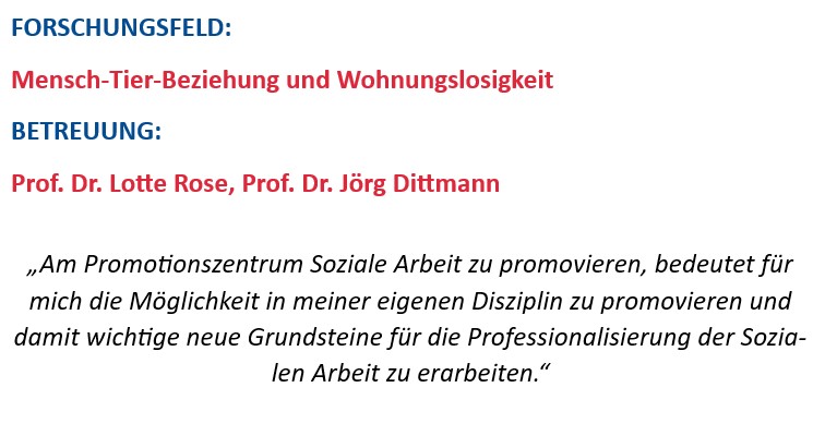 Mit meinem Forschungsprojekt untersuche ich das gemeinsame Leben von Menschen mit Wohnungslosigkeitserfahrung und ihren Kumpantieren in der deutschsprachigen Schweiz, einschließlich bio-psycho-sozialer Aspekten der Mensch-Tier-Beziehung und struktureller Hindernisse für den Zugang zu institutioneller Unterstützung und Versorgung. Dabei verfolge ich einen One-Health-Ansatz, um Aspekte des Wohlbefindens von Mensch und Kumpantier zu berücksichtigen.